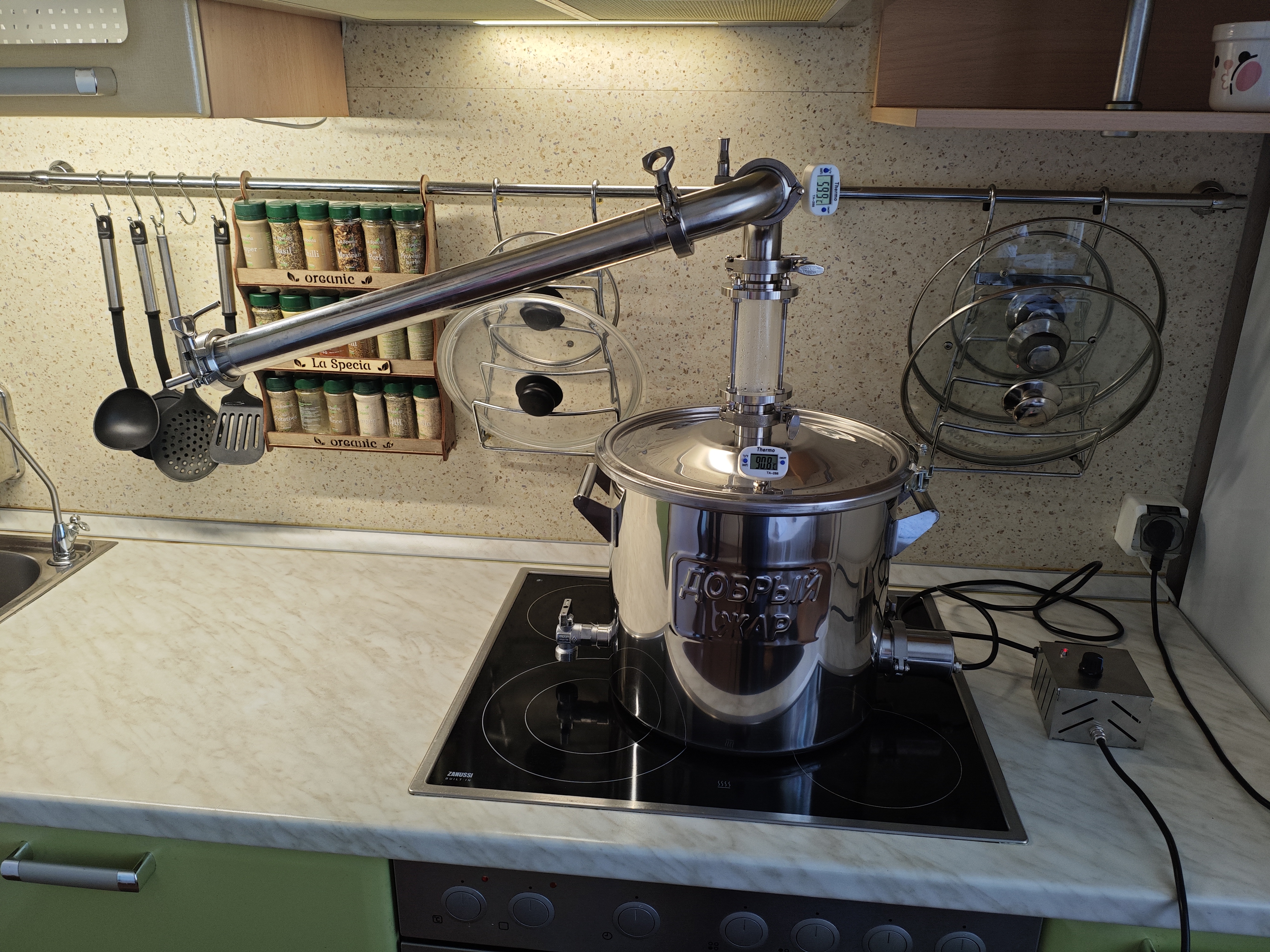 Делюсь последними новостями, в пятницу проводил вторую перегонку, сырье 15 литров ~40% СС и 5 литров воды, гнал всю ночь, с 18:30 до 06:30, по расчетам из 20 литров 30% сырья должно выйти 6 литров АС(абсолютного спирта), итого 900грам ушло на "головы", "тело" составило 4.2 литра, из полученного спирта сдаланна основа дляя "Лимоччело" и "Мятно\Лимонная водка", результат будем посмотреть через 2 недели.